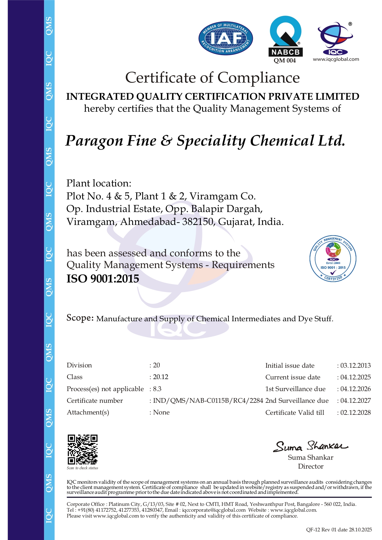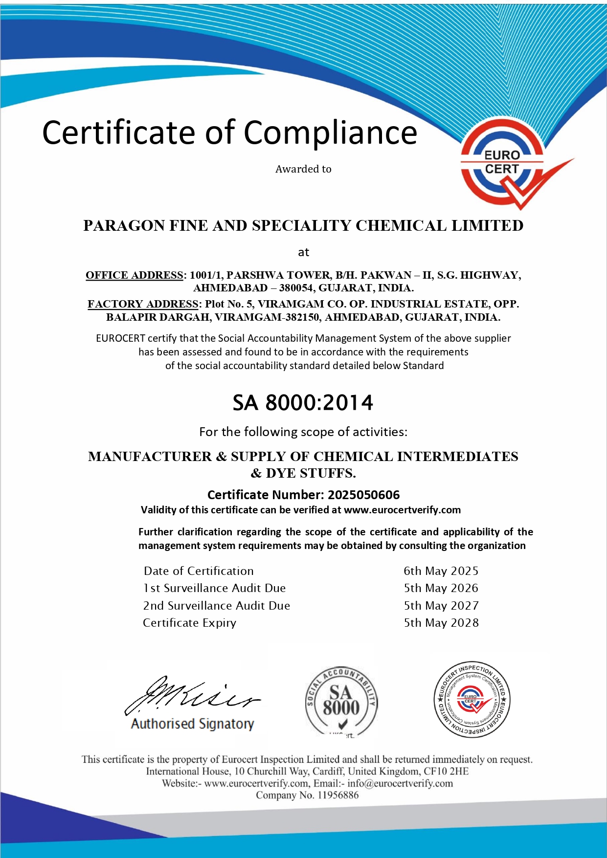 Established in 2004, Paragon Fine and Specialty Chemical Ltd embarked on its journey under the name “PARAGON INDUSTRIES”. With visionary leaders at the helm, we have evolved into a prominent global supplier, specializing in the custom manufacturing of Specialty Intermediates, Cosmetics Intermediates, Pharma Intermediates, and Agro Intermediates. Our diverse range of products finds applications across various industries, including Pharma, Medical devices, Electronics, Paper, Leather, Plastics, and polymers.